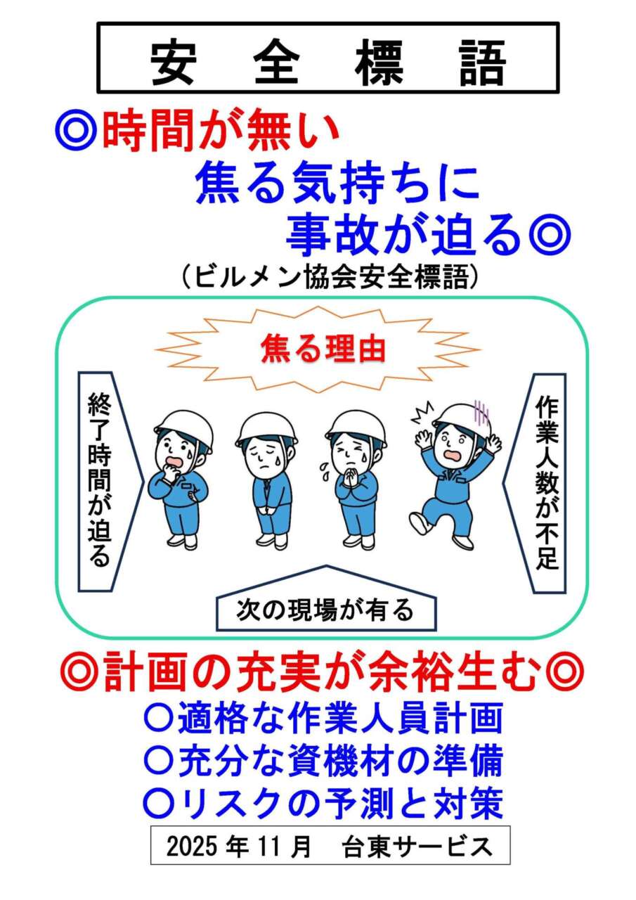 『安全標語』2025年11月 2025年10月29日 最終更新日時 : 2025年10月29日 taitosvc 時間が無い!焦る気持ちに事故迫る 計画の充実が余裕生む!! 適格な作業員計画 充分な資機材準備、リスクの予測と対策を!