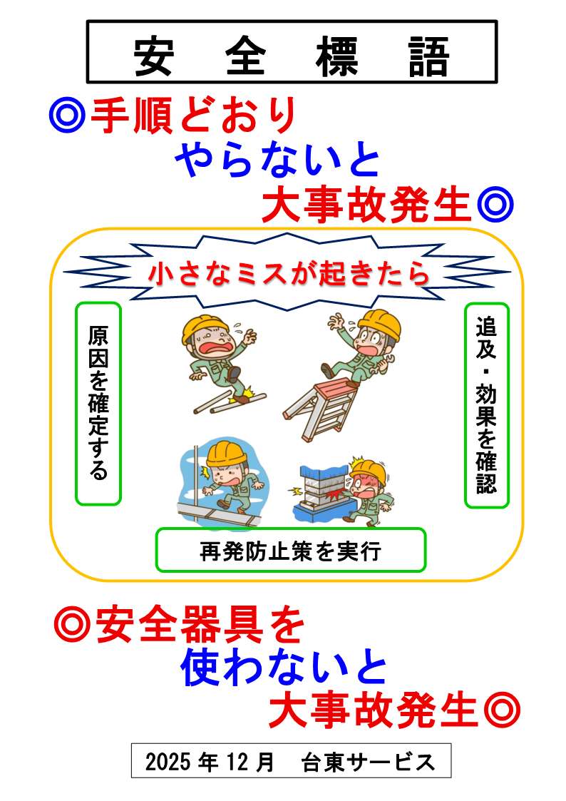 『安全標語』2025年12月 2025年12月1日 最終更新日時 : 2025年12月1日 taitosvc 手順どおり やらないと 大事故発生!! 安全器具を 使わないと 大事故発生!! 小さなミスが起きたら →原因を確定→再発防止策を実行→追及・効果を確認