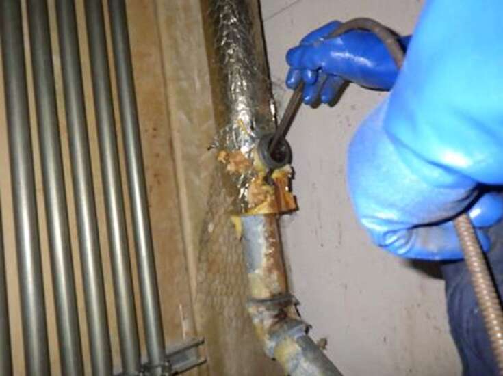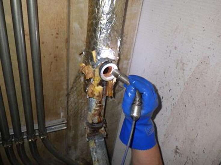 電動ワイヤーによる立て管内の錆詰り除去作業